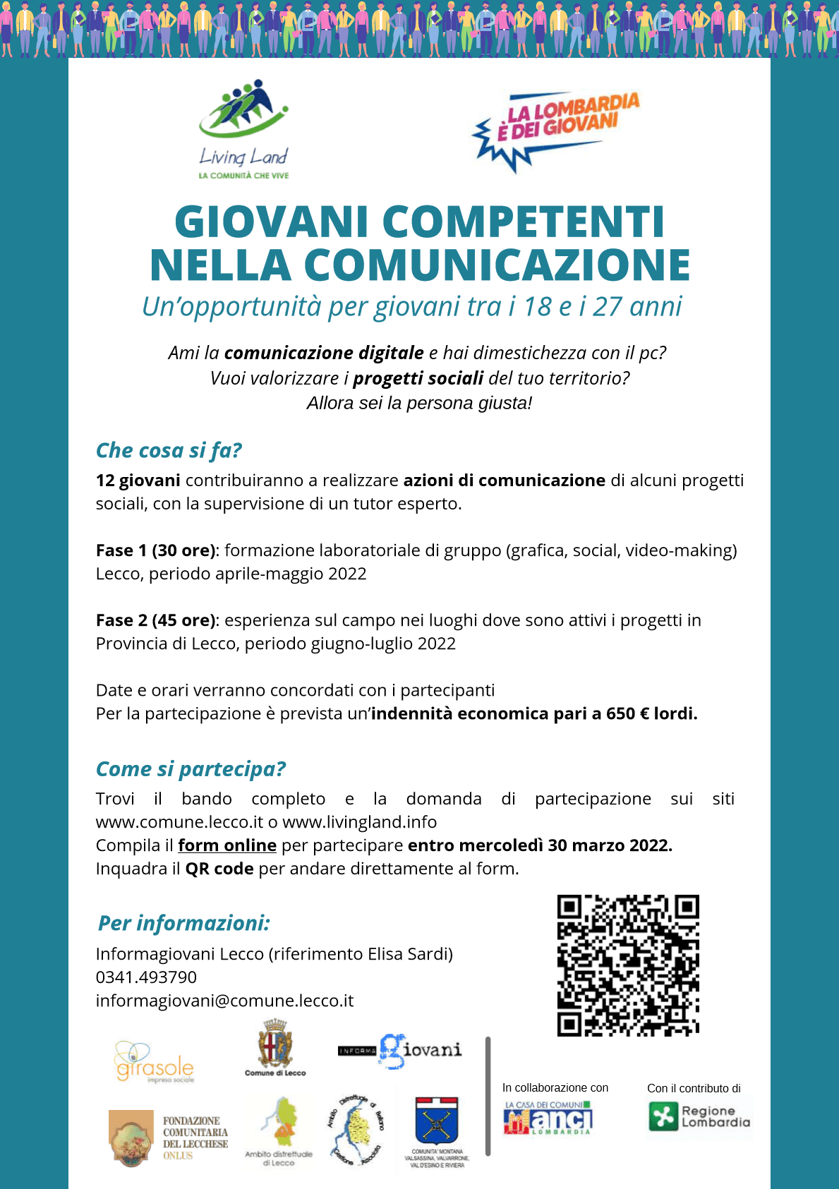 Sono aperte le iscrizioni al nuovo bando “Giovani Competenti nella Comunicazione”, ideato da Informagiovani del Comune di Lecco in sinergia con Consorzio Consolida, Impresa Girasole, Living Land, Ambito distrettuale di Lecco, Ambito distrettuale di Bellano, Fondazione Comunitaria del lecchese e Comunità Montana Valsassina, Valvarrone, Val d’Esino e Riviera. Il progetto si rivolge a 12 giovani tra i 18 e i 27 anni, interessati a intraprendere un percorso esperienziale nella comunicazione digitale e multicanale e di valorizzazione di progetti sociali sul territorio.